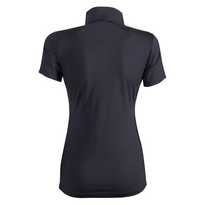 Футболка з коміром-стійкою, закругленою до короткої блискавки спереду, та логотипом на грудях.