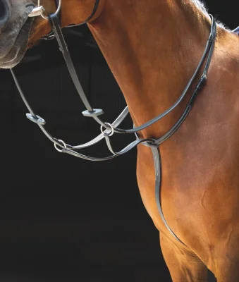 Витончений дизайн мартингалу, що характеризується деталями. Міцний і красиво оброблений. Шкіра рослинного дублення для більш стійкої обробки. Як для змагань, так і для повсякденного використання. Чорна шкіра, фурнітура з нержавіючої сталі.