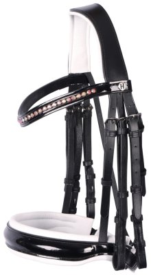 Розкішна, широка лакова носова смуга шириною 4 см (включаючи білу підкладку) і має анатомічну форму навколо заліза. Зі спеціальним, анатомічним, м'яким потиличним. Елегантні вузькі ремінці. Оснащений розкішним, підвісним ремінцем на лобі з лаком та блискучими кристалами.