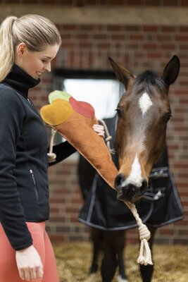 Игрушка для лошади - будет держать вашу лошадь занятой в конюшне, предотвращает скуку. Легко повесить на веревку, примерно 30 см в высоту – общая длина с веревкой 108 см.