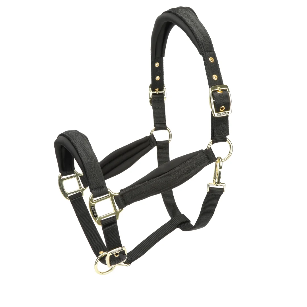 Содействие комфорту, мягкий недоуздок ARMA имеет неопреновую подкладку с низким трением на голове, носе и щеках, мягкие откидные края, чтобы удалить вырезанные бока и создать эффект подушки. Регулируемый с обеих сторон. Высокоглянцевые латунные фирменные пряжки ARMA.
