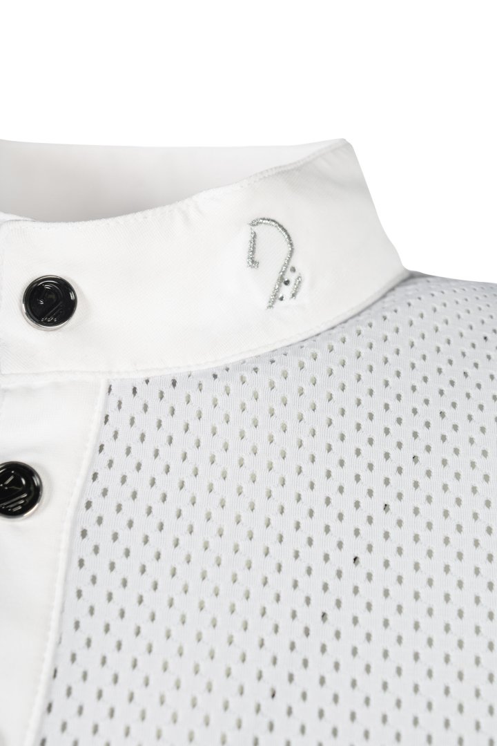 С конкурсной рубашкой Amalfi от Lauria Garrelli вы можете положиться на эксклюзивное качество и элегантный дизайн. Дышащий, эластичный материал обеспечивает максимальный комфорт и оптимальную свободу движений – идеально подходит для требовательных шоу-дней. Элегантные детали на воротнике и высококачественная планка на пуговицах придают рубашке стильный штрих. Стратегически расположенные сетчатые вставки гарантируют отличную циркуляцию воздуха, чтобы вы могли поддерживать приятную температуру тела даже в теплые дни. Дизайн завершается классическим воротником-стойкой, создающим элегантный силуэт.