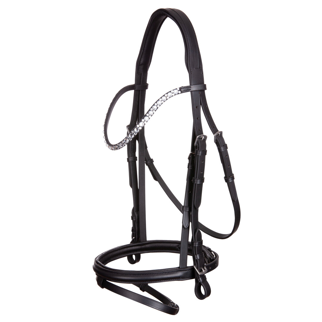 Кожаная трензельная уздечка "Belle" сочетается с узкой и изогнутым налобным ремнем с блестящими-блестящими камнями. Помимо английского комбинированного капсюля, она также имеет мягкую набивку, подложки.