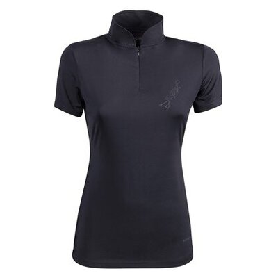 Футболка з коміром-стійкою, закругленою до короткої блискавки спереду, та логотипом на грудях.
