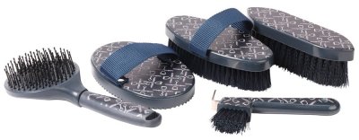 Набір щіток з принтом, що складається з шкребка, жорсткої щітки, м'якої щітки, гачка для копит та для гриви.