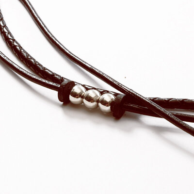 З ефектом браслета складається з 3 шкіряних шнурків, прикрашених срібними намистинами.