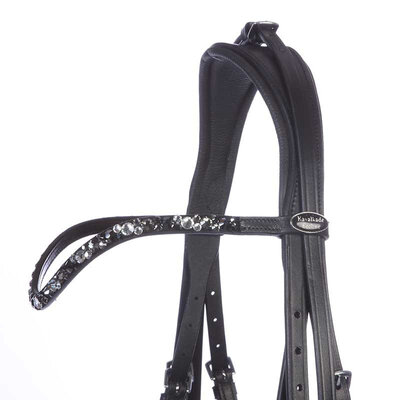 Налобный анатомической формы и щедро украшен декоративными камнями.