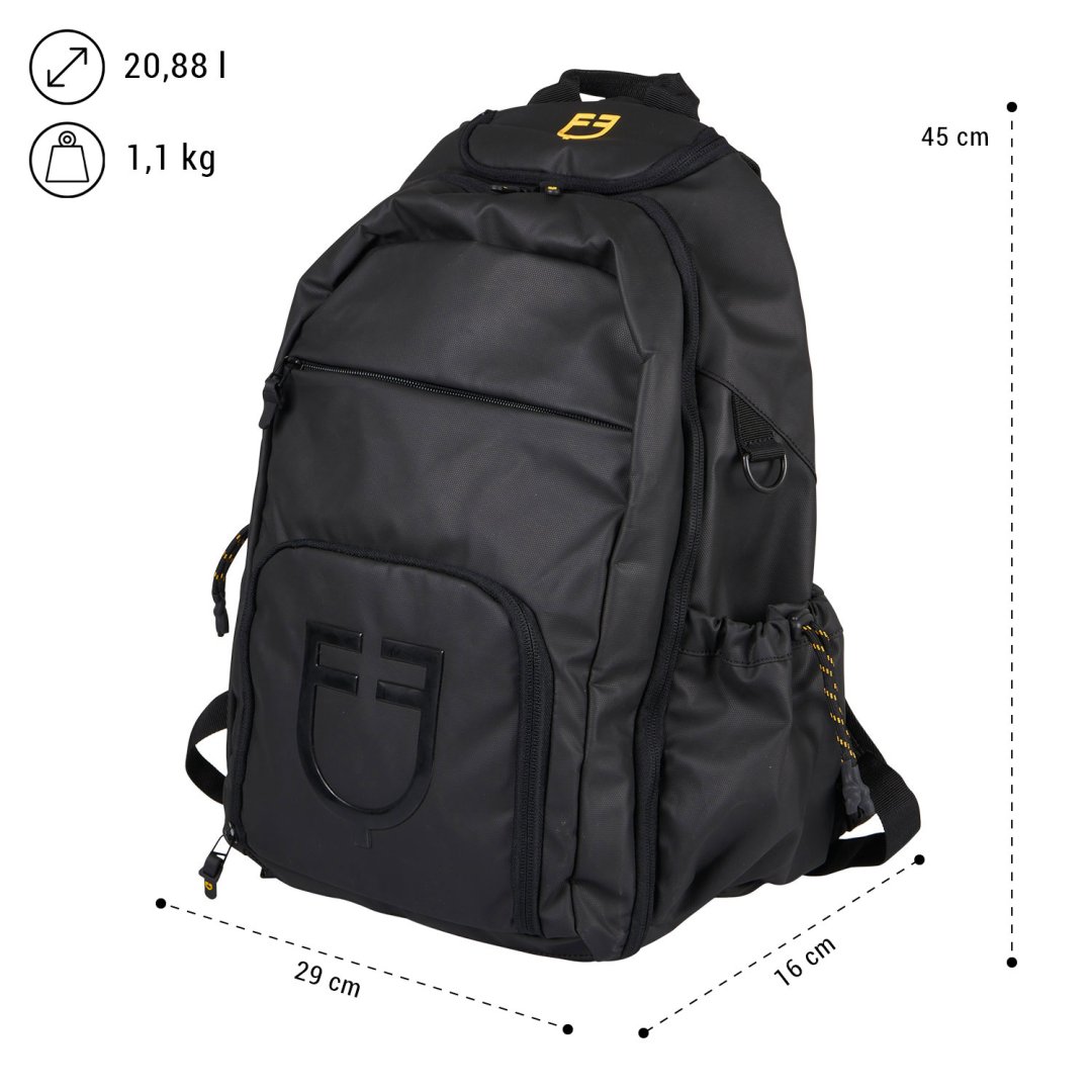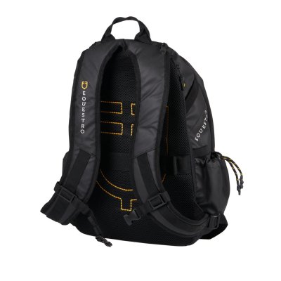 Он также имеет 3D-печатную белую надпись Equestro с правой стороны, 3D-печатный желтый логотип Equestro в верхней части рюкзака и 3D-печать логотипа Equestro глянцевого черного цвета на переднем кармане.