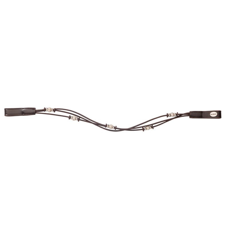 С эффектом браслета состоит из 3 кожаных шнурков, украшенных серебряными и белыми бусинами. Белый жемчуг дополнительно украшен небольшими серебряными стразами.