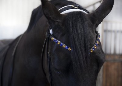 Изогнутый налобный ремень с цепочкой из больших цветных стразов на мягкой основе. Крючки застежки.