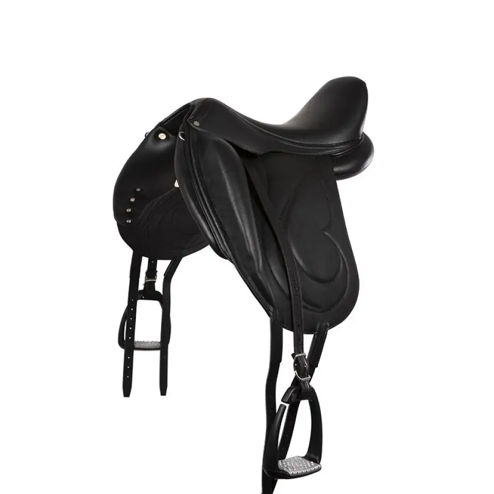 Седло оснащено V-образными панелями, которые обеспечивают идеальное распределение давления по спине лошади и стабилизируют положение седла, способствуя удобству и безопасности.