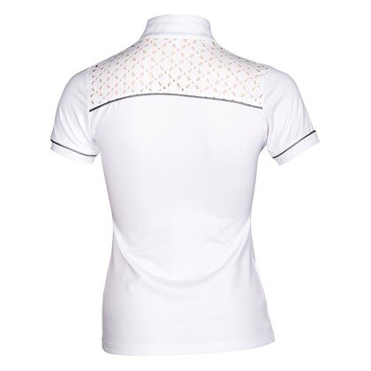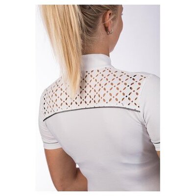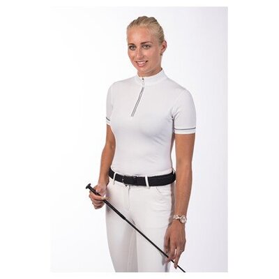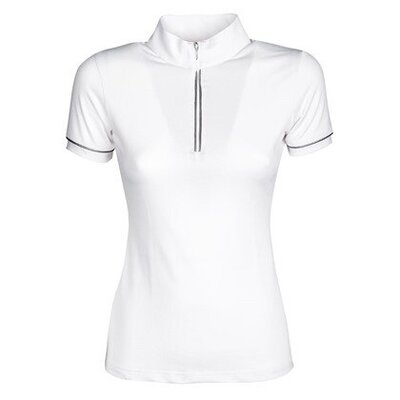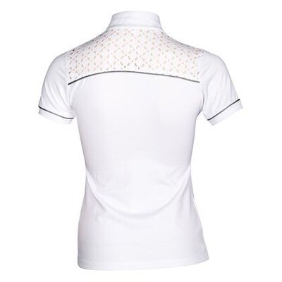 Рубашка для соревнований с коротким рукавом, белым воротником-стойкой, короткой застежкой-молнией с серебристой окантовкой, серебристая окантовка на рукаве и спинке, верхняя часть сзади перфорирована.
