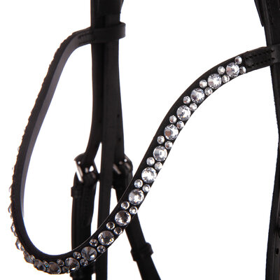 Кожаная трензельная уздечка "Belle" сочетается с узкой и изогнутым налобным ремнем с блестящими-блестящими камнями. Помимо английского комбинированного капсюля, она также имеет мягкую набивку, подложки.